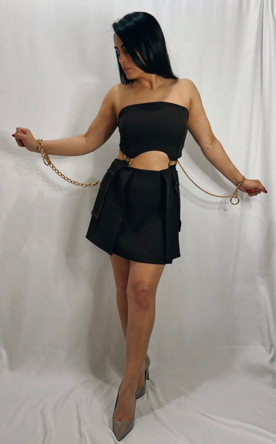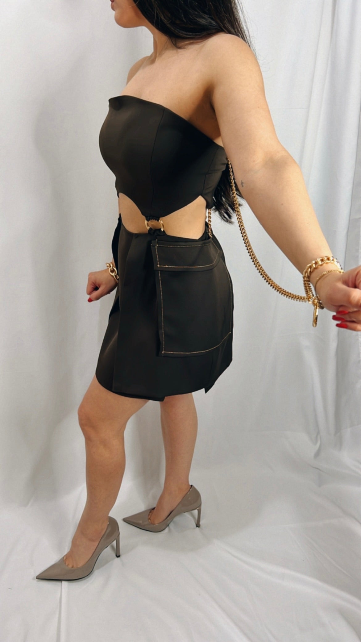 Infine L’ imponente catena a grossi anelli ovale oro metallizzato che dona un pizzico di erotismo necessario a renderlo un pezzo unico